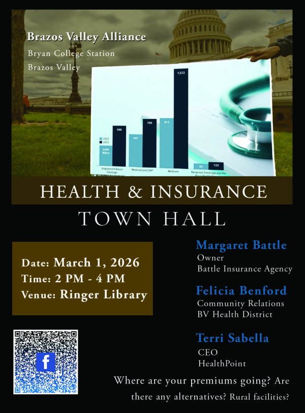 Greetings! We are hosting a Town Hall at Ringer Library on Sunday March 1, 2026 from 2:00 pm to 4:00 pm. The Q&A topic is Insurance and Health Resources in our community. We are looking forward to Q&A's from our panelists Felicia Benford from the Brazos Valley Health District, Terri Sabella CEO of Healthpoint, and Margaret Battle of Battle Insurance Agency. Additionally, Felicia and Terri are bringing teams to answer questions about local health services and options